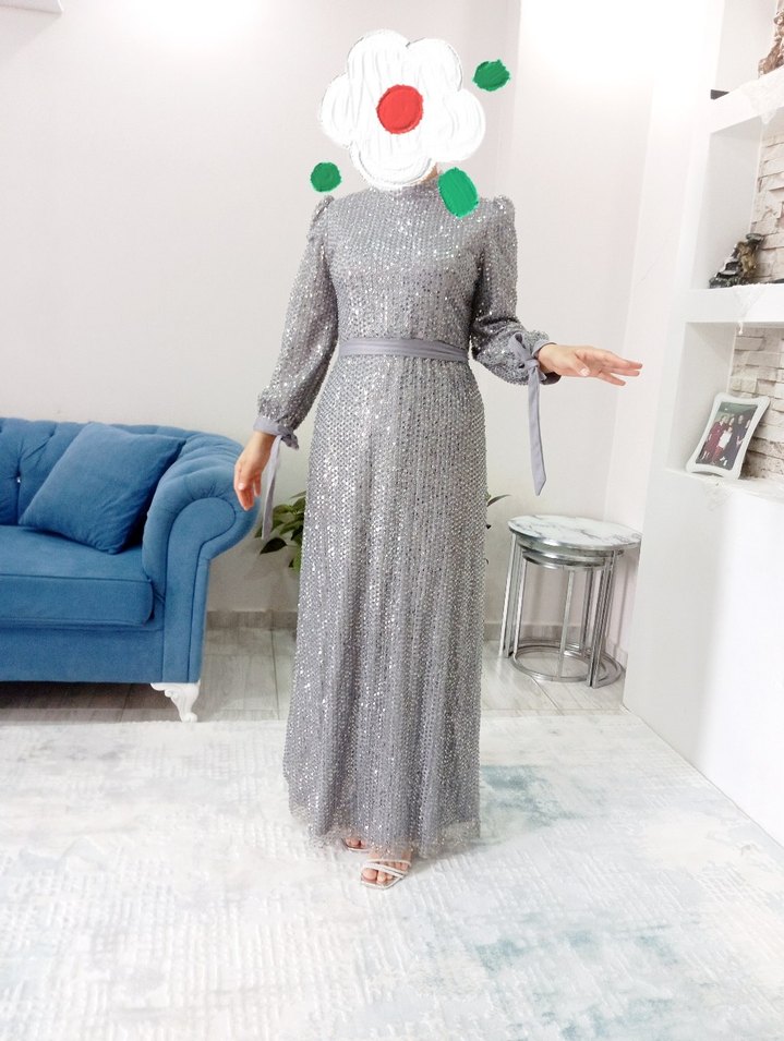 Gri Uzun Kollu Payet İşlemeli Abiye Elbise