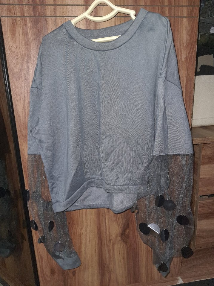 Gri Uzun Kollu payetli bluz