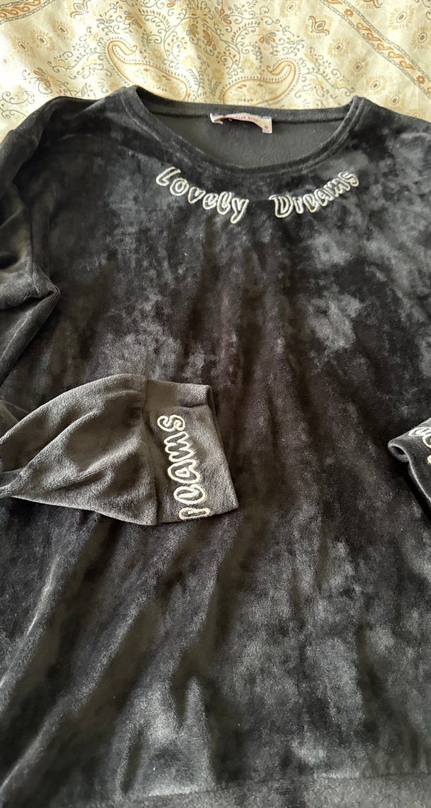 Gri renkli, uzun kollu ve yuvarlak yakalı sweatshirt. Yumuşak peluş kumaş ve 'Lovely Dreams' baskılı detaylarla rahat ve gotik tarzda.