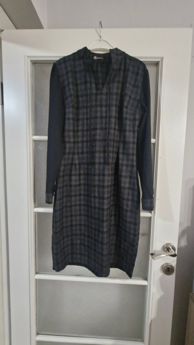 Gri Uzun Kollu Pileli Ekose Elbise