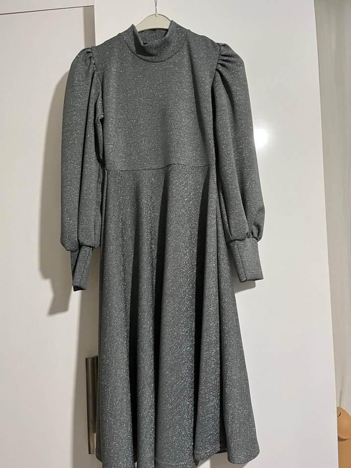 Yumuşak sentetik kumaştan yapılmış, yüksek yakalı ve pilili tasarımlı gri uzun elbise. Bol kesim ve uzun kolludur, modern ofis stiline uygundur. Terzide dikilmiştir 36 beden için uygundur ekstra bağlama kuşağı var