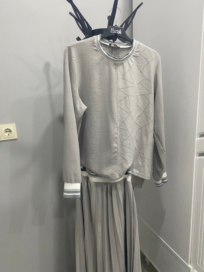 Gri renkte, uzun kollu ve yuvarlak yaka pilili kadın ikili takım . Rahat kesimi ve yumuşak ayrobin kumaşıyla gündelik kullanıma uygundur.