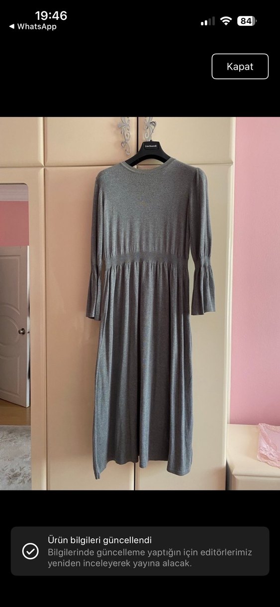 Standart bedendir. 2-3 defa giyildi. Gri renkli, uzun kollu, pilili ve bol kesim kadın elbisesi. Yumuşak triko kumaştan, günlük rahat kullanım için uygundur.