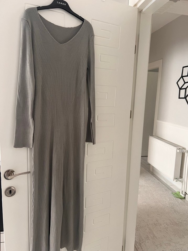 V yaka ve uzun kollu, triko kumaştan yapılmış, pilili ve bol kesim gri uzun elbise. Minimalist tarzda, günlük kullanım için uygundur.