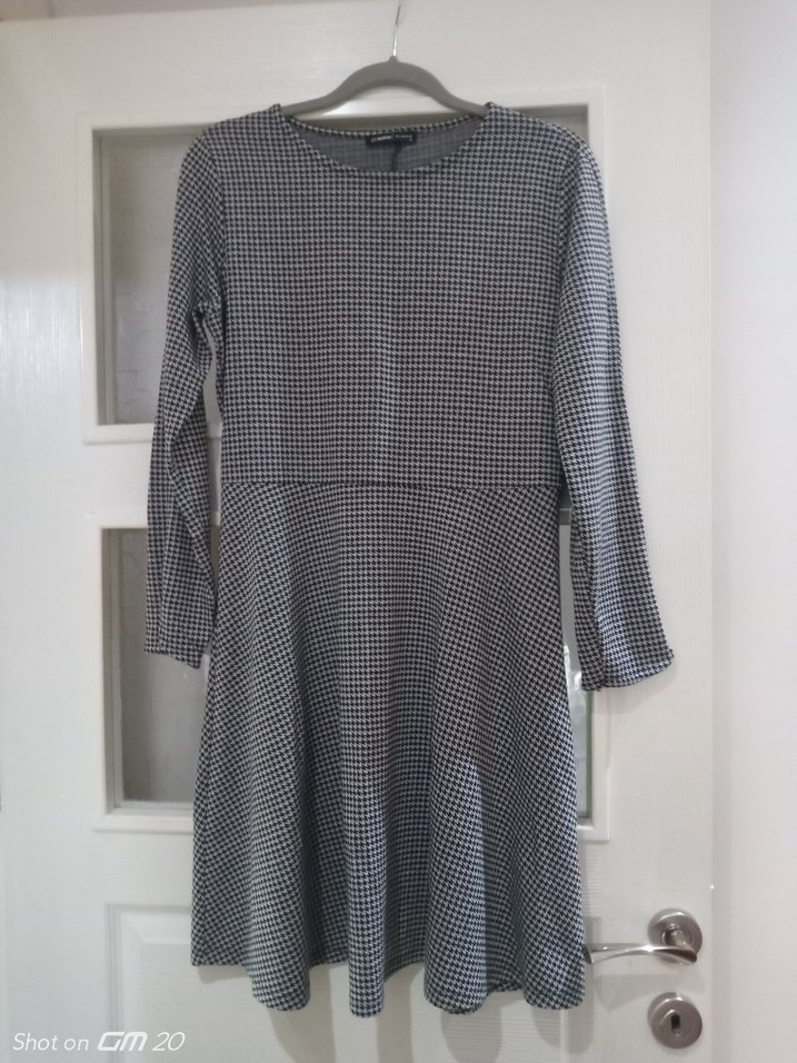 Gri renkli, uzun kollu, bisiklet yaka ve bol kesime sahip kloş elbise. Yumuşak triko kumaştan üretilmiş, ince kareli deseniyle ofis kullanımı için uygundur. ✨