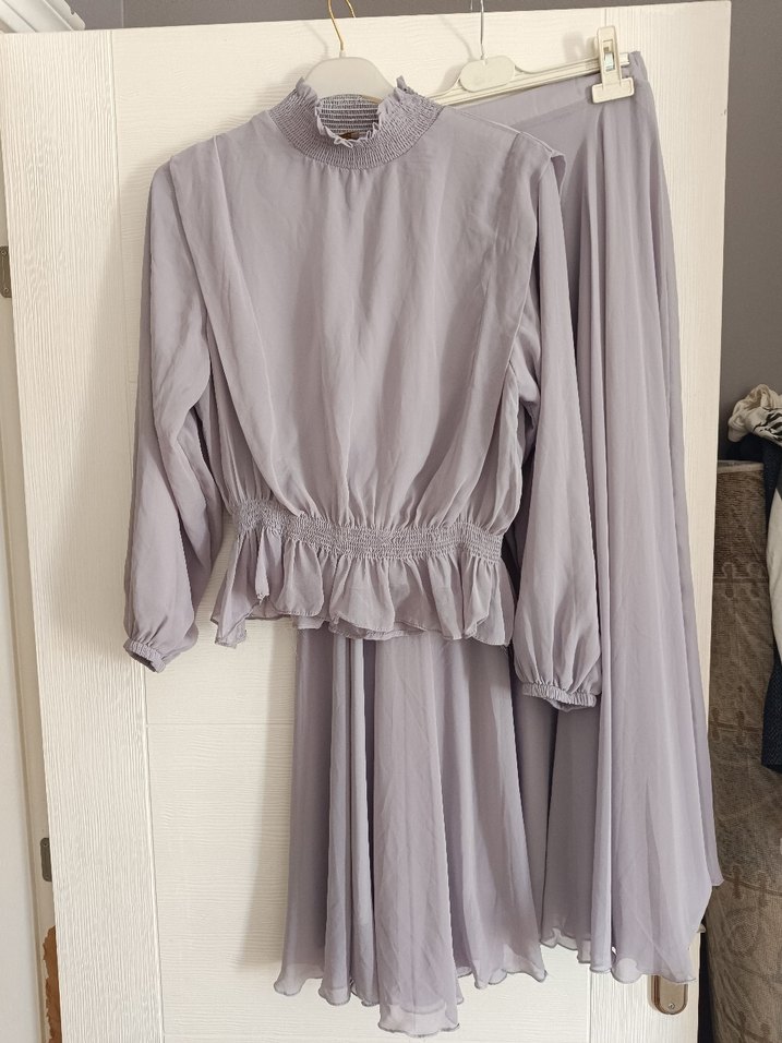 Gri renkte, yüksek yakalı ve uzun kollu, yumuşak şifon takım