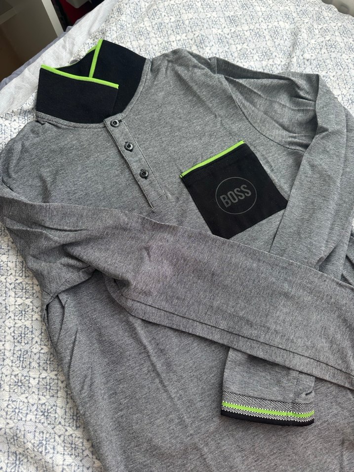 Gri uzun kollu polo tişört, yakada düğme detayı ve baskılı ceple dikkat çeker. Sentetik kumaştan üretilmiş, rahat kesim ve sportif tarz sunar. 14 yaş s beden