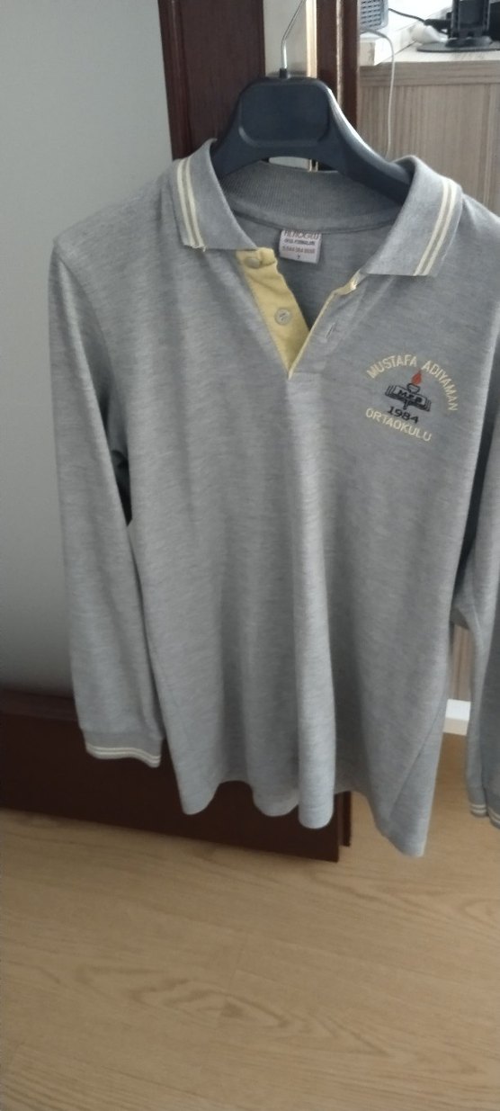 Gri renkli, uzun kollu, düğmeli polo yaka erkek sweatshirt. Rahat kesimli, yumuşak ve sıcak kumaştan, baskılı detaylıdır. Mustafa Adıyaman ortaokulu Kepez Antalya okulunun forması uzun kollu ve kısa kollu 2 adettir Fiat ikisinin fiyatıdır ikisi 300 tl