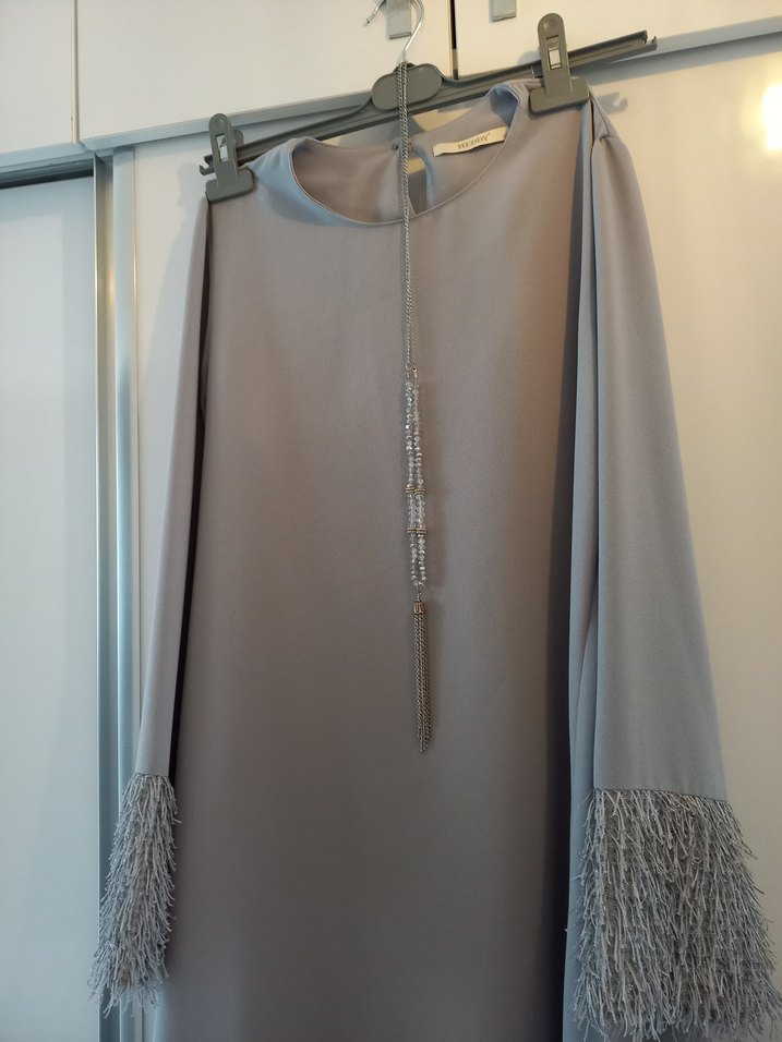Gri renkte, uzun kollu ve püsküllü uçlara sahip bol kesim elbise veya tunik . Yuvarlak yaka ve bohem tarzda, ipeksi dokuda. Kolyesi de mevcuttur 105 cm boyundadır