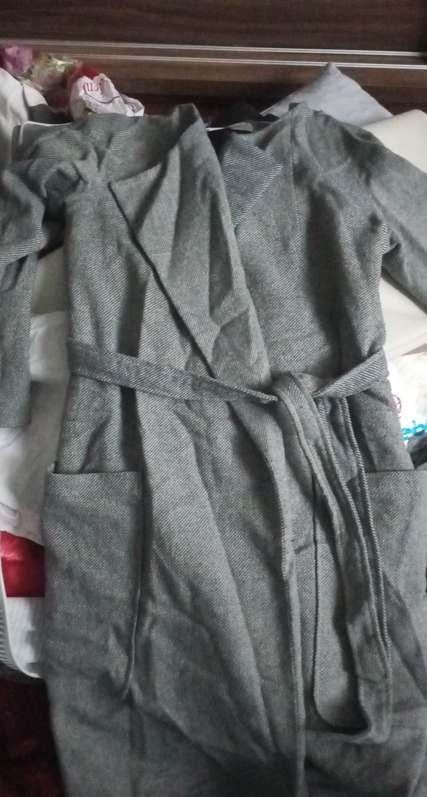 Gri renkte, uzun kollu ve bol kesim kadın kaban. Uzun boylu, kemerli ve desensiz, rahat normcore tarzında bir tasarım. ️