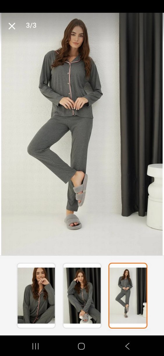 Uzun kollu, gri renkte, rahat kesim kadın pijama takımı. Normal midi boyda, sade pembe şerit detaylı.