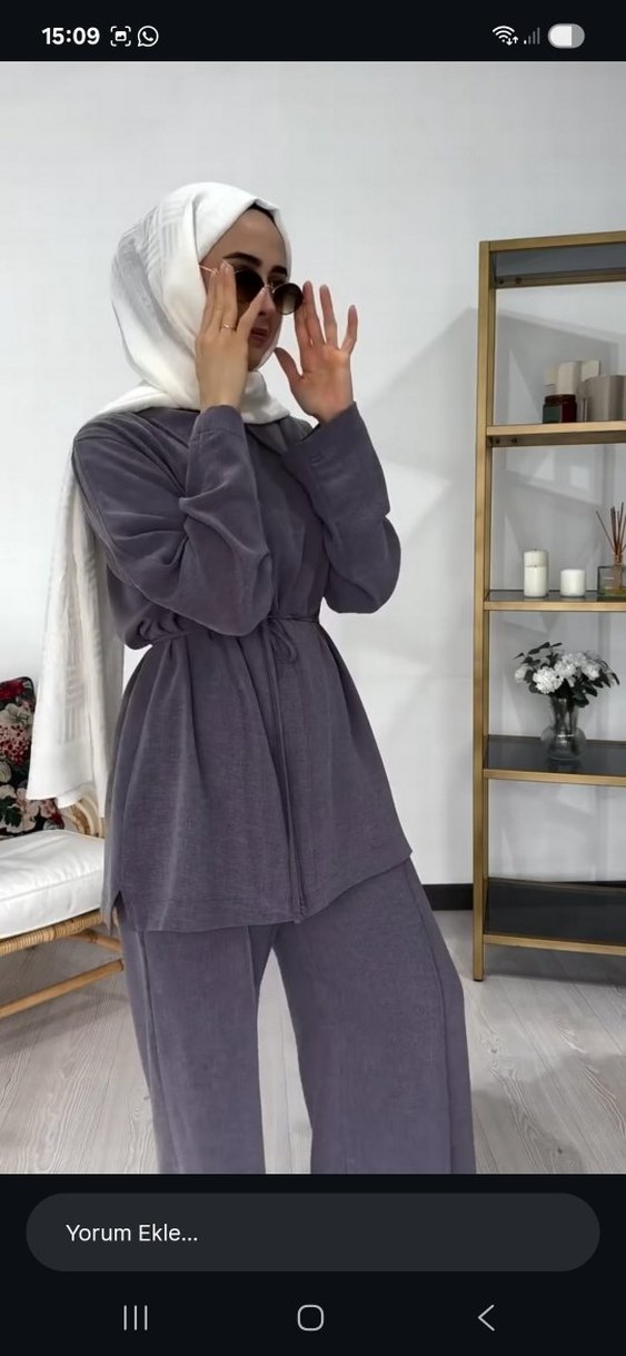 Gri renkli, keten kumaştan, uzun kollu ve yüksek yakalı, bol kesim kadın takım elbisesi. Günlük kullanım için rahat ve şık bir modeldir. tensel kumas