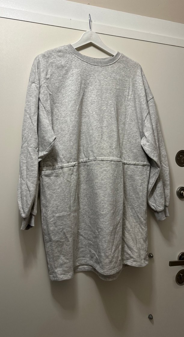 Gri renk, yuvarlak yakalı uzun kollu sweatshirt, rahat kesim ve midi boyda. Yumuşak keten kumaştan, günlük kullanım ve rahat sokak stili için uygundur.