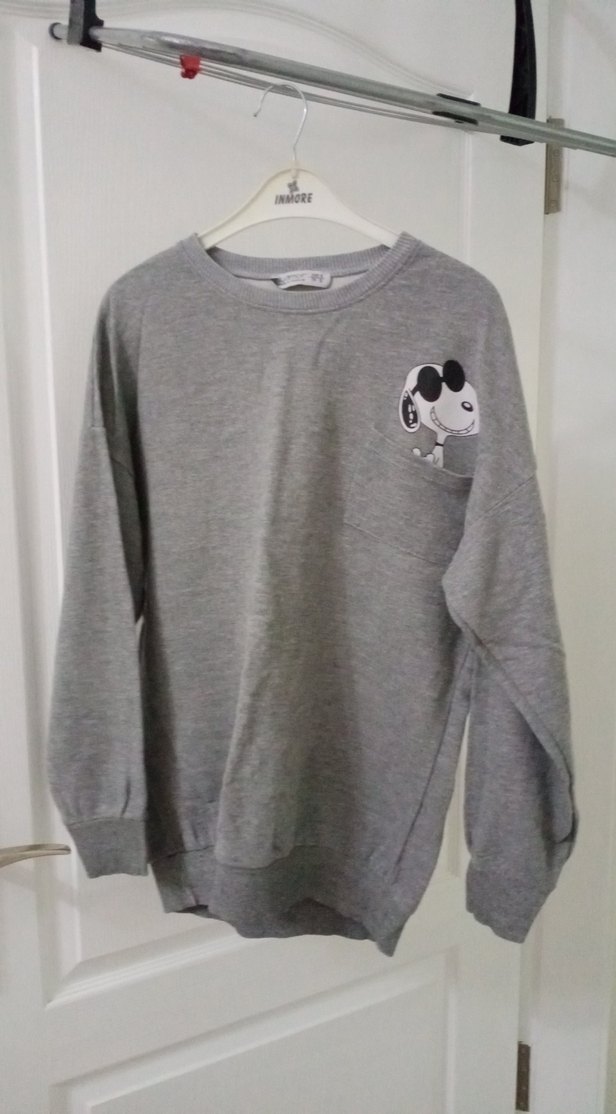 Gri renkli, uzun kollu, bisiklet yaka ve rahat kesim midi uzunluğunda sweatshirt. Yumuşak dokulu örgü kumaş ve göğüs cebinde baskılı çizgi film deseni bulunur.