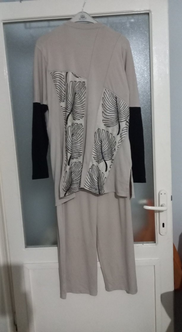 Gri renkte, uzun kollu ve salaş kesim kadın takımı. Ön kısmında yaprak desenli drapeli detaylar bulunur. Günlük kullanıma uygun, çağdaş ve avangart tarzda.biraz leke var yıkayınca çıkar galiba