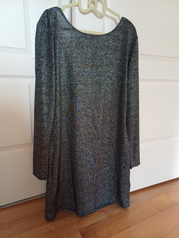 Uzun kollu, bisiklet yaka ve salaş kesimli triko elbise. Gri renkte, yumuşak sentetik kumaştan yapılmış, hafif parlak dokusu ile parti stiline uygundur.