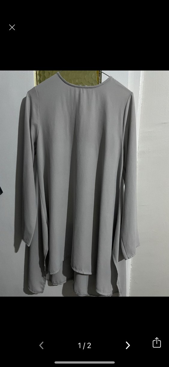 Gri renkte, uzun kollu ve salaş kesime sahip tunik. Yumuşak sentetik kumaştan üretilmiş, drapeli ve desensiz tasarımla minimal bir görünüm sunar. Sorunu yok kumaşından dolayı bazı yerlerinde ip çeliği var ama belli olmuyor