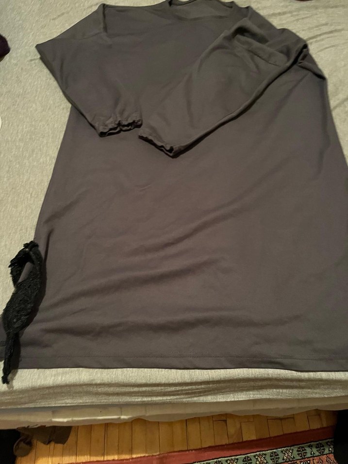 Gri renkte, salaş kesim, uzun kollu ve drapeli tarzda, yuvarlak yaka tunik. Yumuşak sentetik kumaştan üretilmiştir.