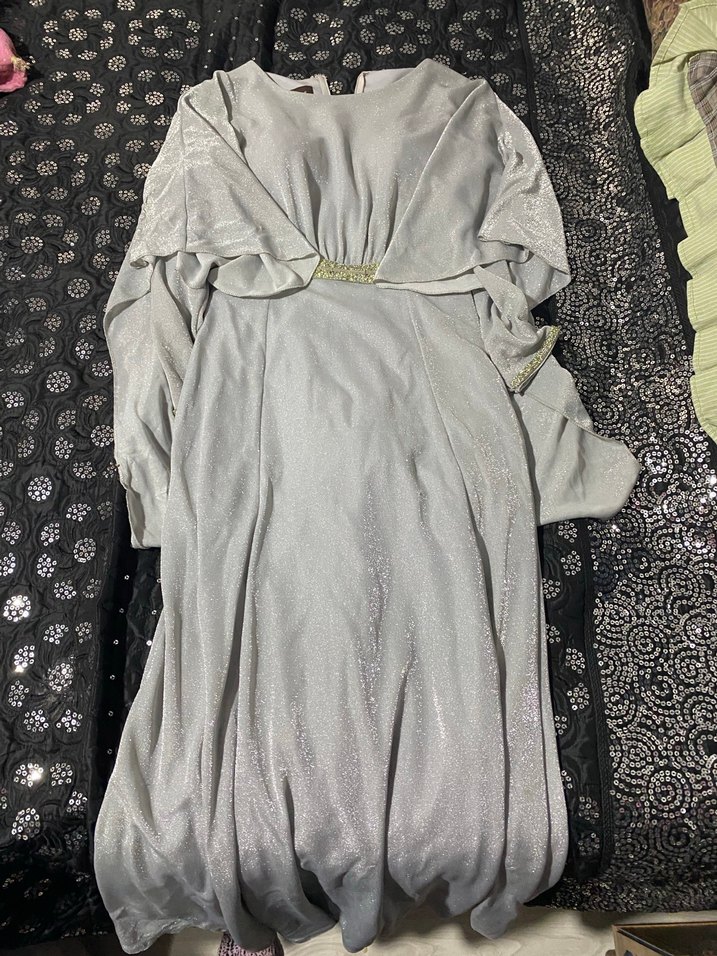 Gri renkte, drapeli ve salaş kesimli uzun vintage kadın elbisesi. Uzun kollu ve straplez yakalı, düğün için uygundur. ✨