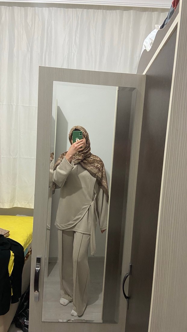 Kadınlar için bol kesim, uzun boylu, ipeksi ve şeffaf kumaştan gri takım. Yüksek yakalı, uzun kollu, minimal desensiz günlük sokak stili takımı. Sadece bir kez denendi bana bol geldiği için satıyorum