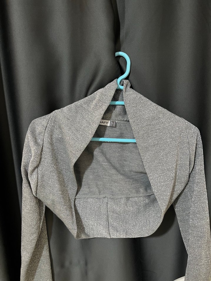 gri, uzun kollu ve yakalı, vücuda oturan bolero. Yumuşak sentetik kumaştan, salaş bir drapeli tarzda, Simli ve dikkat çekici gecelere uygun ✨