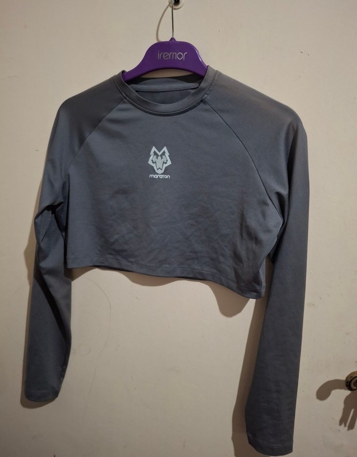 Bu gri, uzun kollu ve baskılı crop top, sentetik kumaştan üretilmiş, dar kesim ve yuvarlak yaka detayına sahiptir. Spor ve günlük şıklık için uygundur. Önünde 'vemor' markası bulunur.