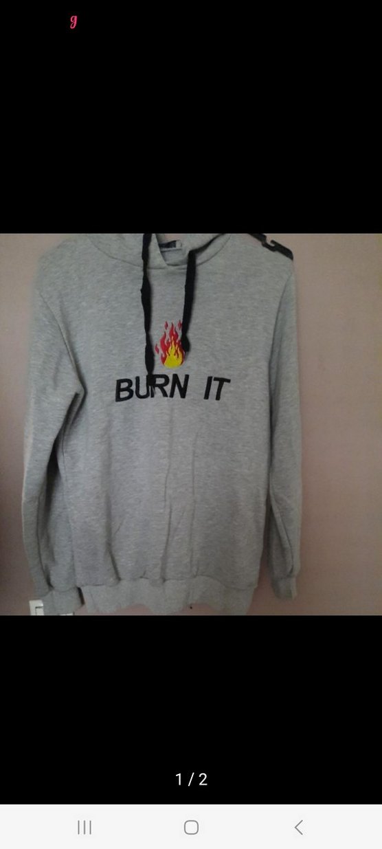 Gri, uzun kollu, yuvarlak yaka ve bol kesim sweatshirt. Üzerinde alev ve 'BURN IT' baskısı bulunur. Yumuşak ve sıcak kumaştan üretilmiştir.