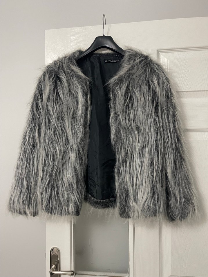 Gri Uzun Kollu Suni Kürk Ceket 38 bedenede uygundur