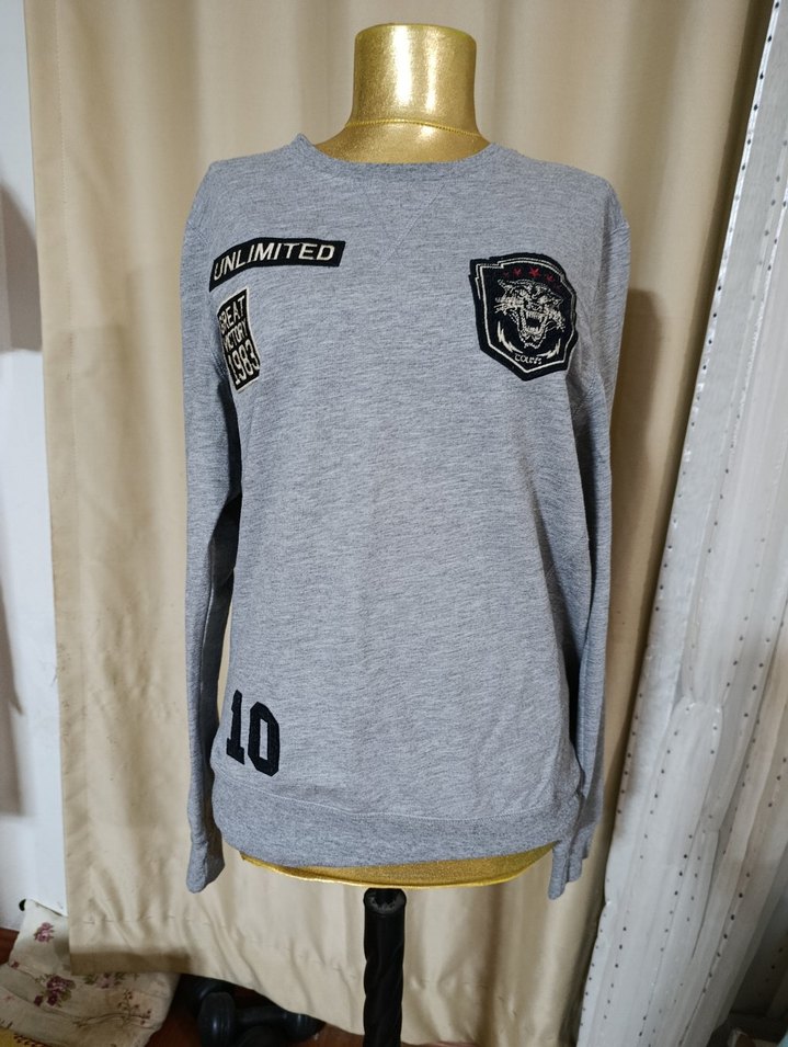 Gri, baskılı detaylara sahip uzun kollu, salaş kesim sweatshirt. Spor ve günlük kullanım için rahat bir seçenek. ♀️