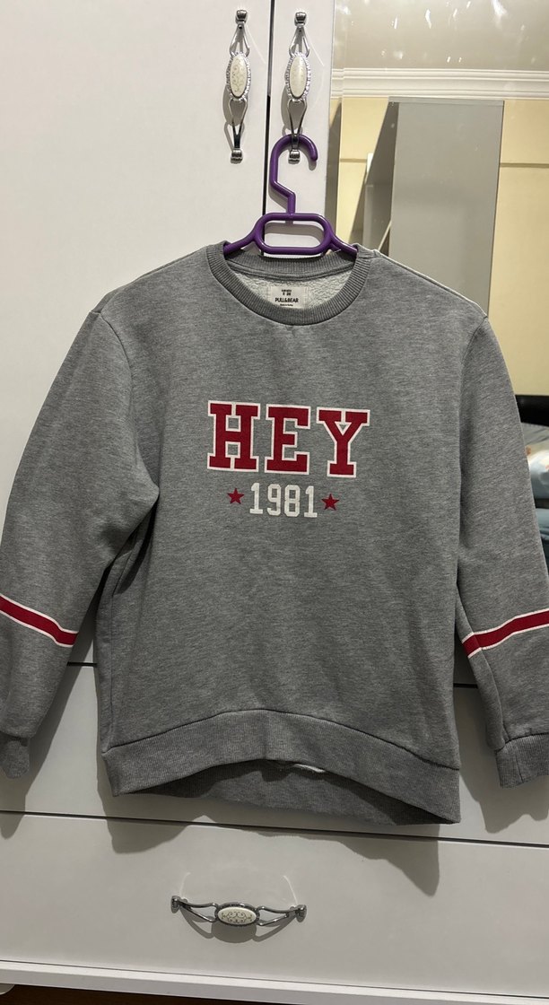 Gri renkte, uzun kollu ve yuvarlak yakalı sweatshirt. S beden. Birkaç kere giydim.