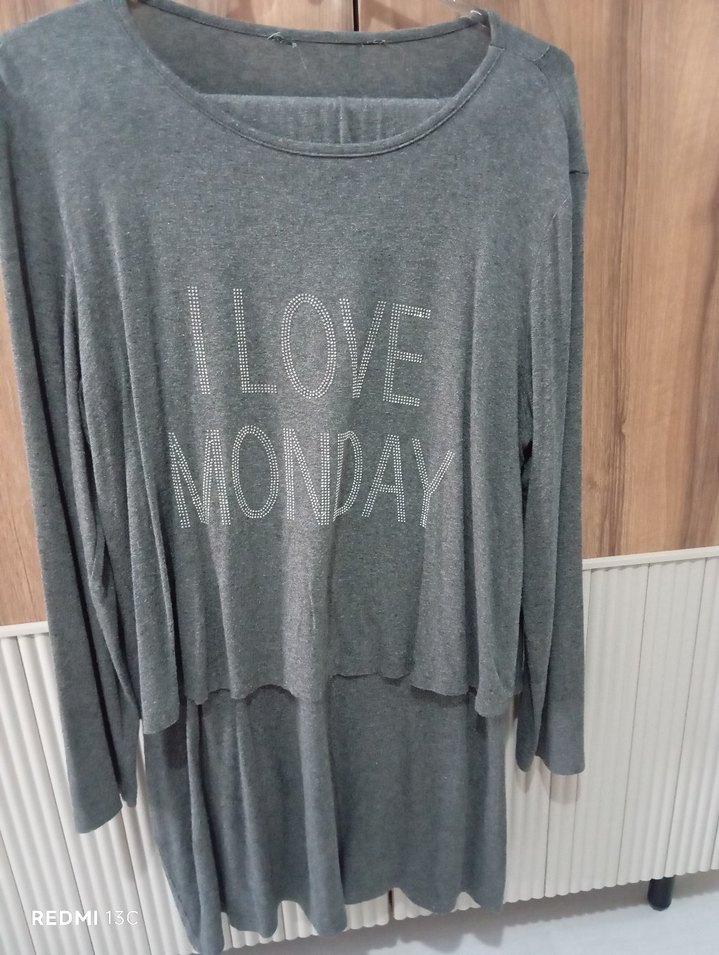 Gri renkli, uzun kollu, crew neck ve bol kesim gömleği. Nefes alabilen keten kumaştan, 'I LOVE MONDAY' baskılı, midi boyda rahat kullanıma uygun. takım