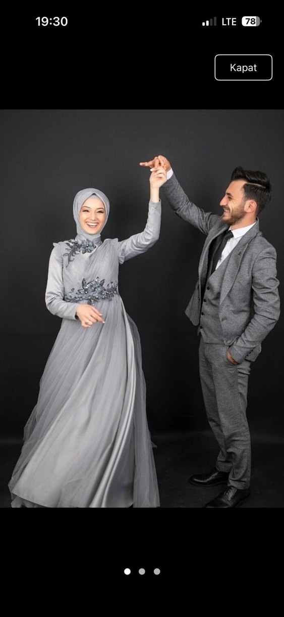 Gri renkli, etnik desenli ve drapeli uzun kollu nişan elbisesi. Modern klasik tarzda, notched lapel yakalı, tesettür ve uzun boyda, şık ve gösterişli bir seçenek.