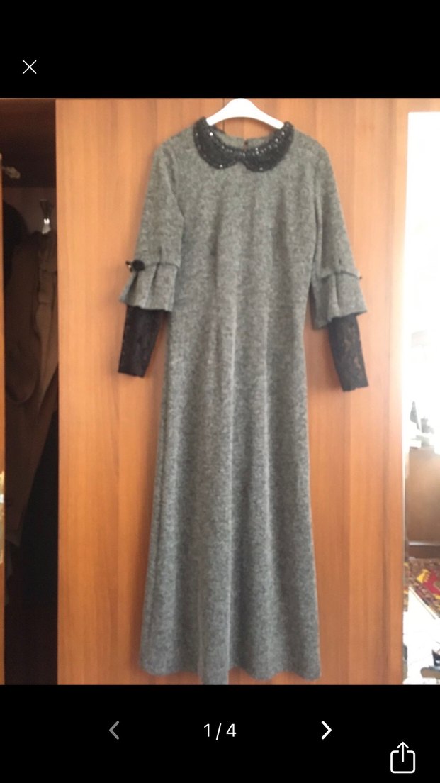 Gri renkte, uzun kollu kışlık kumaştan çok şık bir elbise hiç giyilnedi