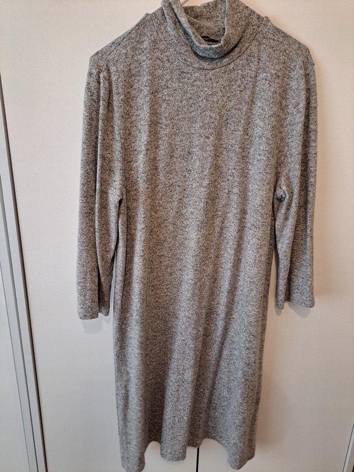 Gri renkli, uzun kollu ve yüksek yakalı triko elbise. Yumuşak keten kumaştan üretilmiş, bol kesimli ve uzun boydur. Rahat ve günlük kullanıma uygundur.