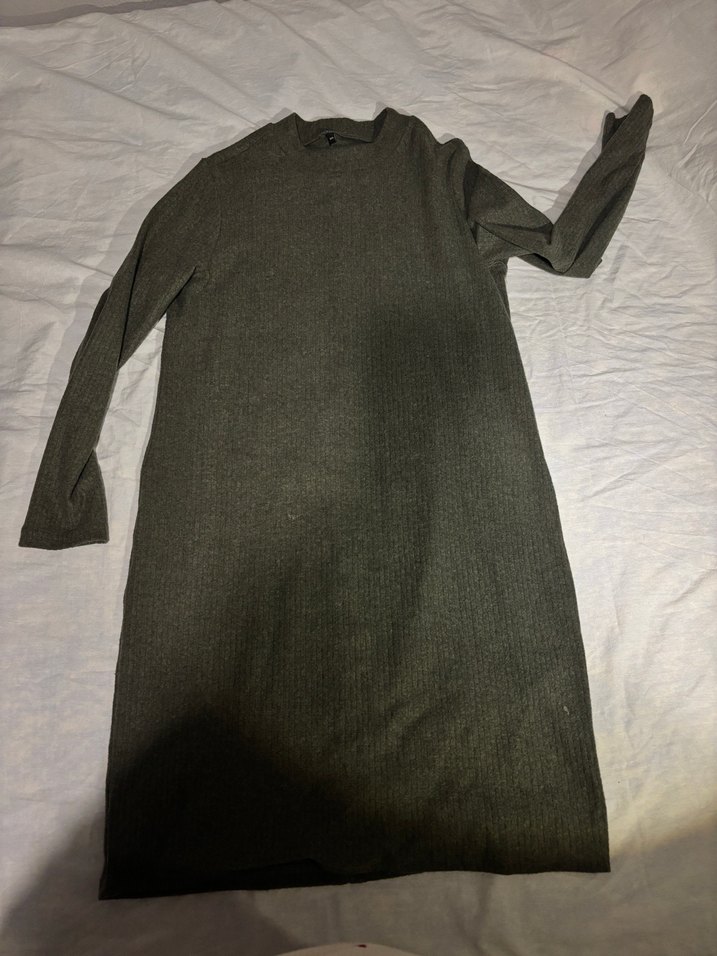 Uzun kollu, yüksek yakalı, triko dokulu gri renkli keten kumaştan yapılmış, vücuda oturan uzun elbisedir. Rahat ve günlük kullanıma uygundur.
