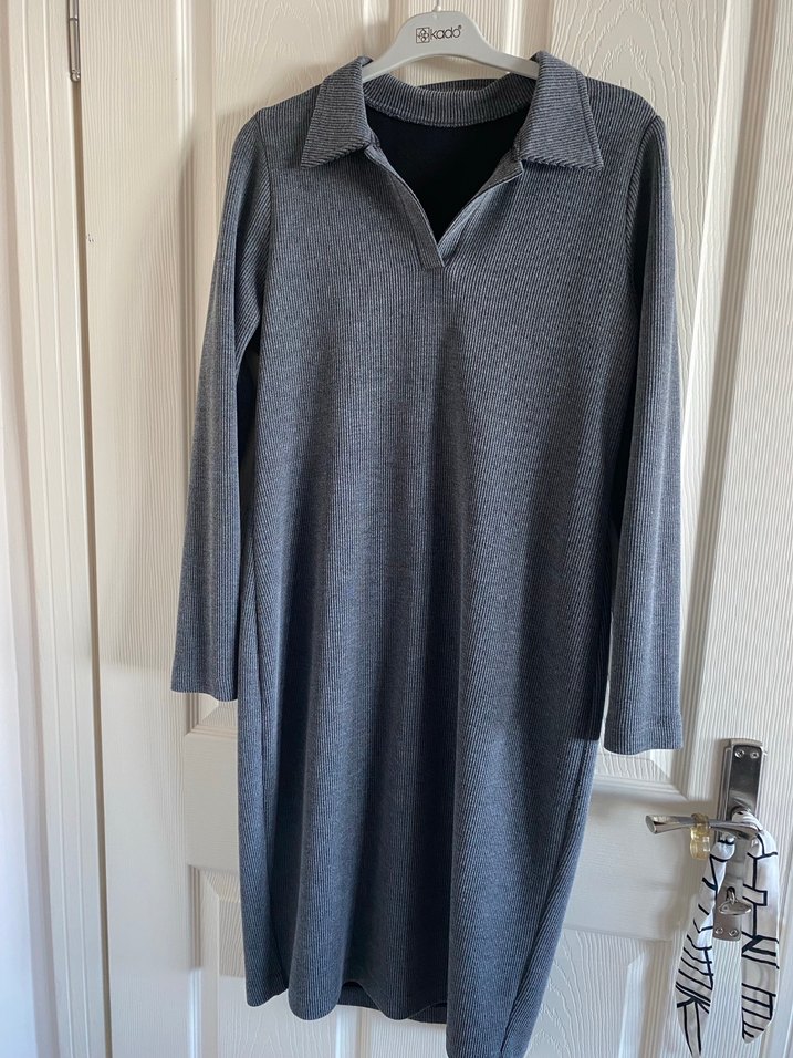 Gri renkte, uzun kollu ve yakalı triko elbise. Rahat kesimi ve drapeli detaylarıyla yumuşak ve sıcak kumaştan üretilmiştir.