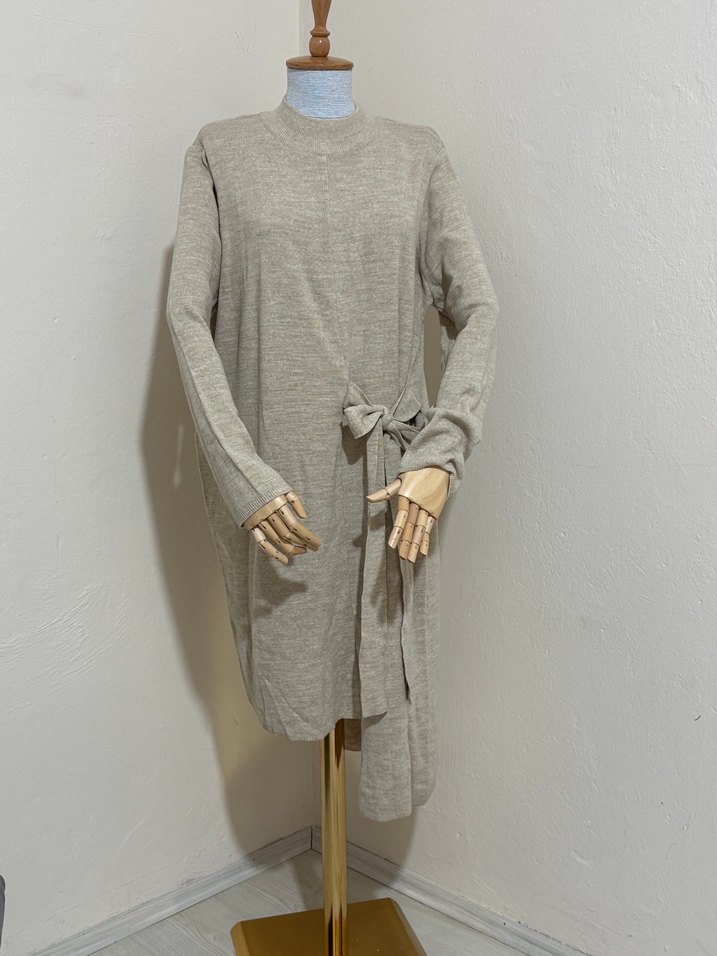 Bej renkte, yüksek yakalı ve uzun kollu triko elbise. Rahat kesimi, örgü dokusu ve yan bağlama detayıyla konforlu bir normcore stil sunar.
