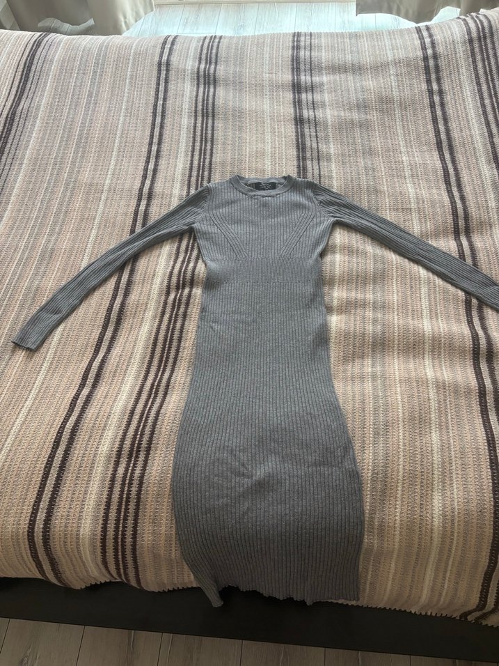 Gri renkte, yüksek yakalı ve uzun kollu, triko dokulu, vücuda oturan uzun elbisedir. Rahat ve günlük sokak tarzına uygundur.