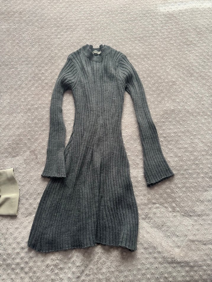 Gri renkli, uzun kollu ve yüksek yakalı, vücuda oturan triko elbise. Uzun boyu ve sade tasarımıyla günlük kullanıma uygundur.