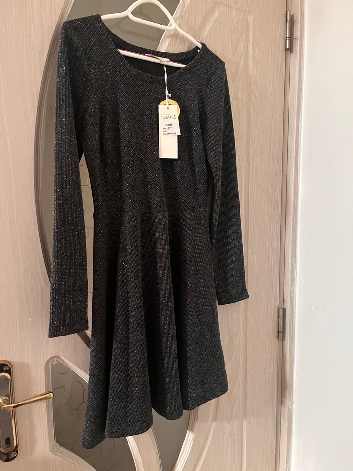 Gri renkli, uzun kollu, yuvarlak yaka ve triko dokulu, baskılı detaylı, vücuda oturan kadın elbisesi.