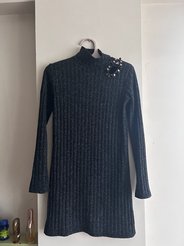Gri renkli, uzun kollu ve boğazlı yakaya sahip, yumuşak triko kumaştan yapılmış, rahat ve sade tasarımlı kadın elbisesi. Günlük kullanım için uygundur.