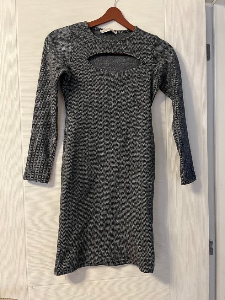 Gri, uzun kollu, triko kumaştan yapılmış, vücuda oturan kesime sahip, yuvarlak yakalı ve kesik detaylı rahat kadın elbisesi. Çok iyi durumda