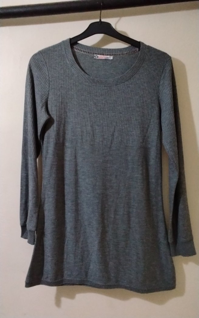 Gri renkte, yuvarlak yaka ve uzun kollu kadın kazak. Yumuşak yünden örülmüş, bol kesim ve normal midi boyda, günlük kullanım için uygundur.