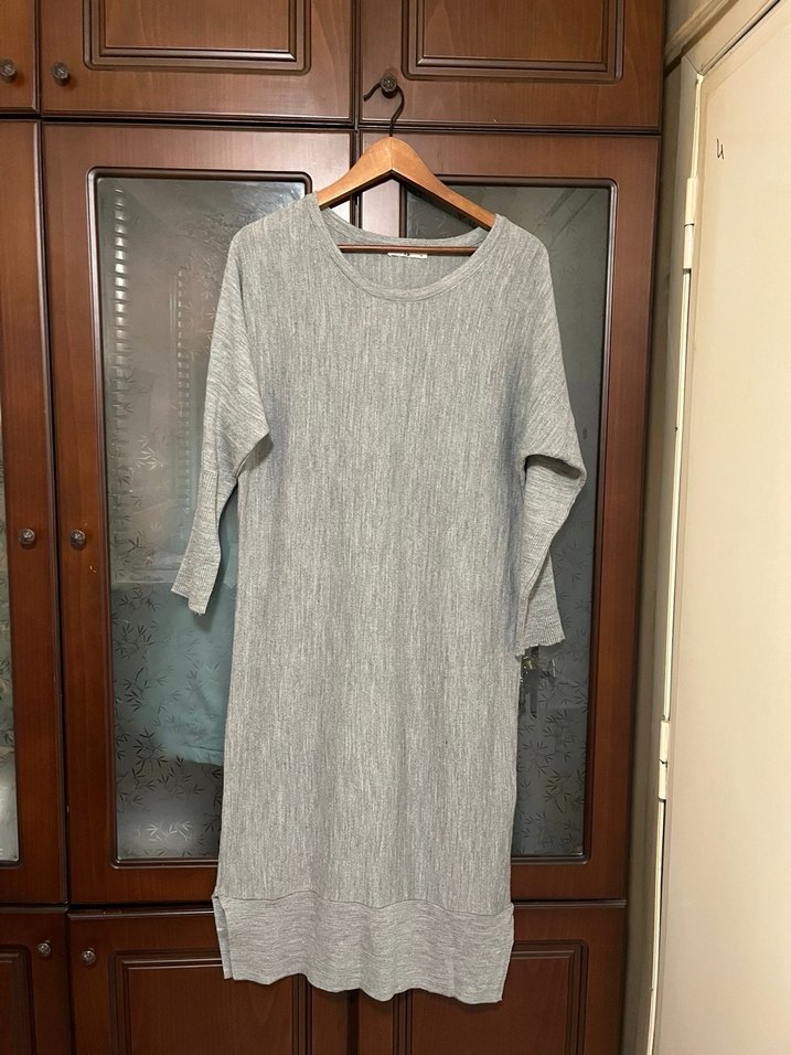 Gri renkte,, uzun kollu ve yuvarlak yakalı, bol kesim midi elbisedir. Rahat ve gündelik kullanıma uygundur. İki koltuk altı arası eni 64 cm boy 116 cm