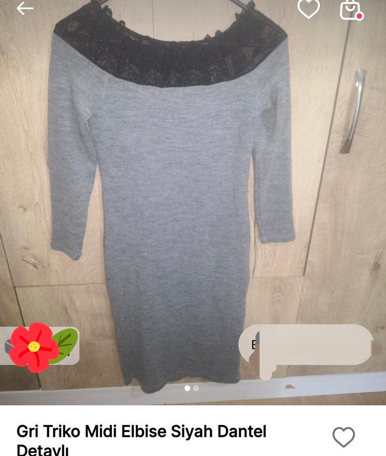 Gri, uzun kollu, vücuda oturan midi elbise. Triko kumaştan yapılmış olup, yakasında siyah dantel detayı vardır. Rahat ve şık günlük kullanım için uygundur.