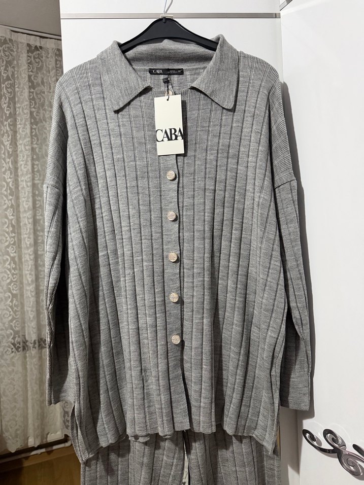 Gri, uzun kollu, düğmeli ve yakalı kadın hırkalı takım . Rahat kesimi ve yumuşak triko kumaşıyla günlük kullanıma uygundur. CABA marka. Standart bedendir