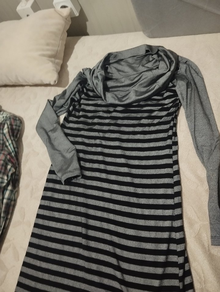 Gri ve siyah çizgili, uzun kollu, drapeli kayık yaka, vücuda oturan hamile tunik. Yumuşak sentetik kumaştan, günlük rahat sokak stili için uygundur.