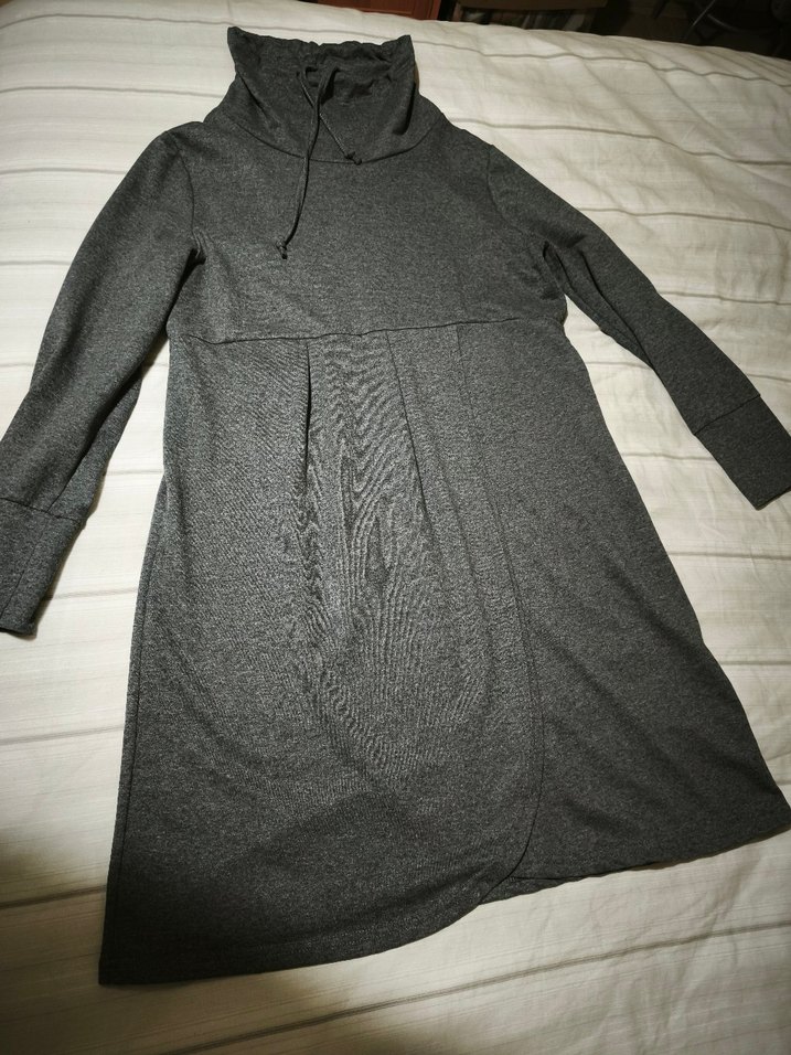 Yüksek yakalı, uzun kollu ve bol kesimli gri tunik.rahat günlük kullanım için drapeli tasarım.