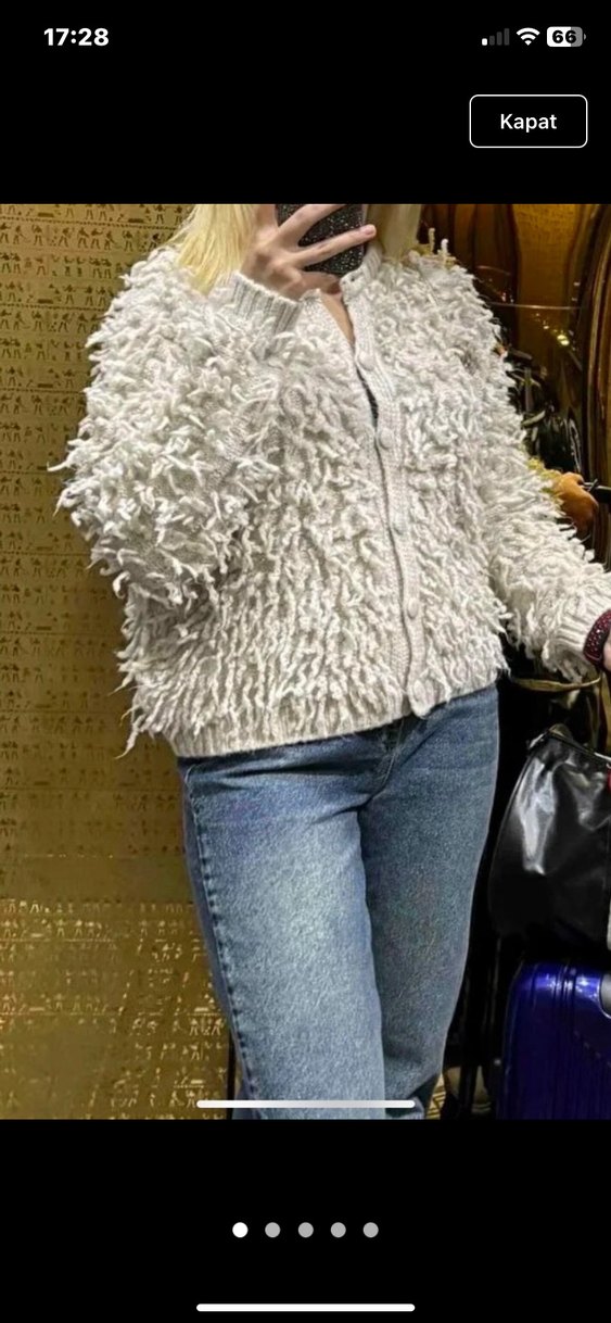 Gri renkte, uzun kollu, yuvarlak yakalı, tüylü detaylı ve bağlama desenli rahat kesim hırka.