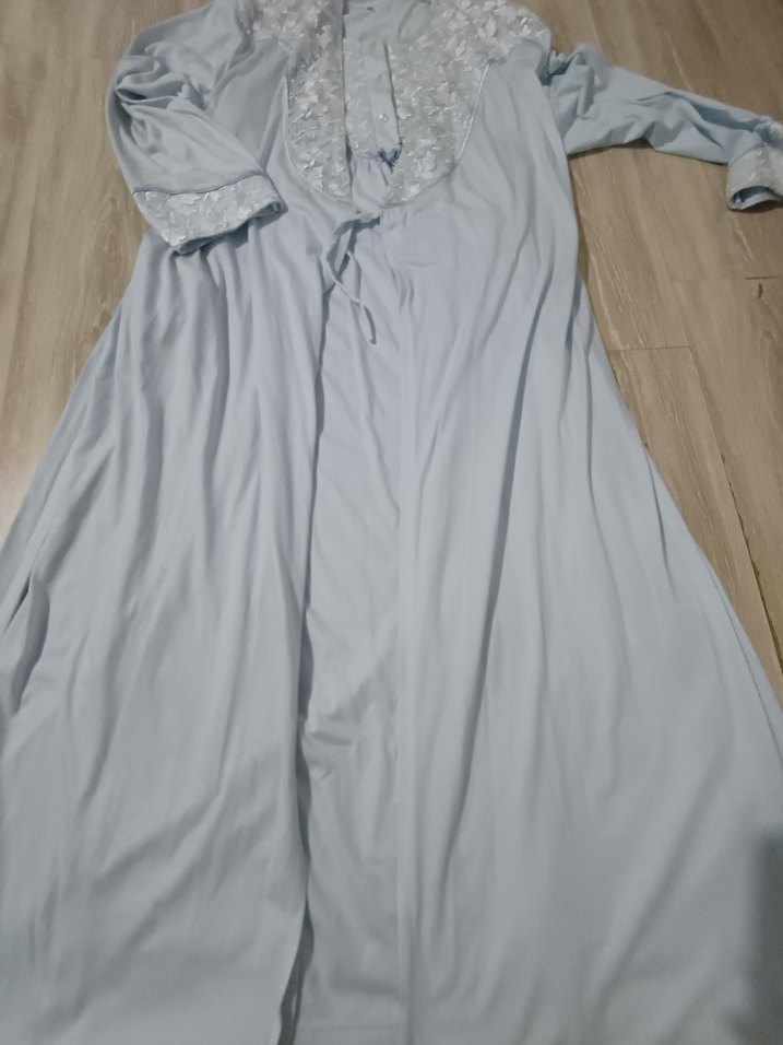 Gri renkte, uzun kollu ve V yakalı, bol kesim uzun hemşirelik sabahlığıdır. Göğüs ve manşetlerde ince dantel detayı bulunur.